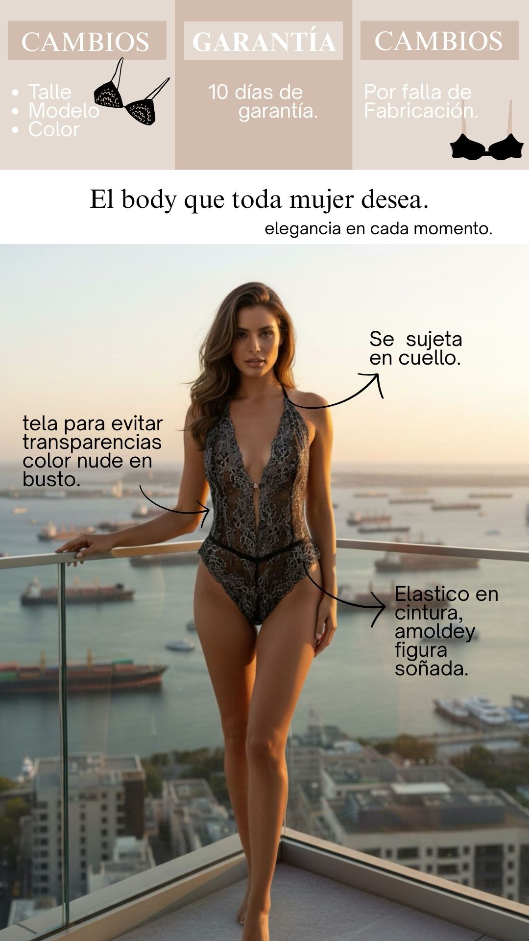 Este body de encaje, completamente regulable, redefine la forma en que tu cuerpo se muestra y se siente.