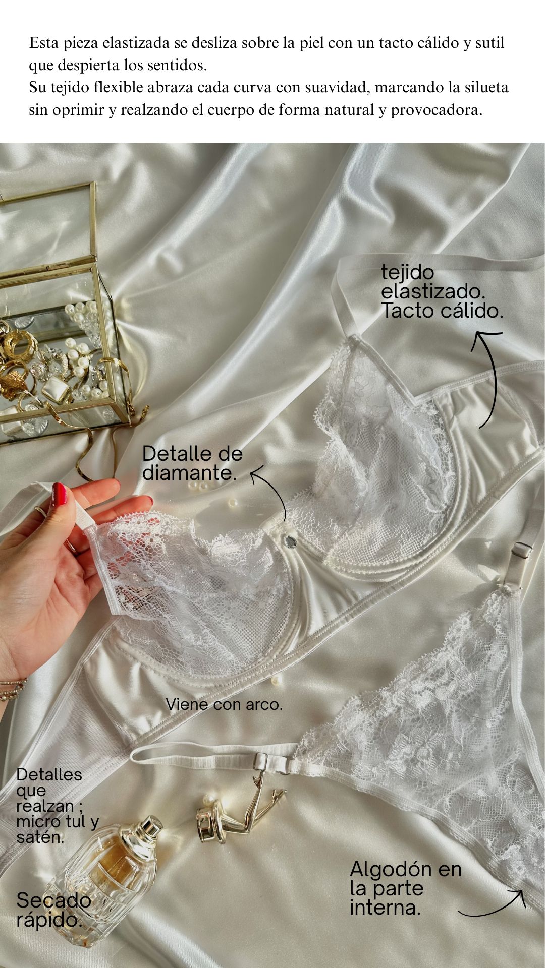 Encaje delicado y elástico, combinado con satén brillante y microtul translúcido en el corpiño. Bombacha íntegra de encaje con forro interno de algodón. Texturas nobles, pensadas para lucirse y sentirse.