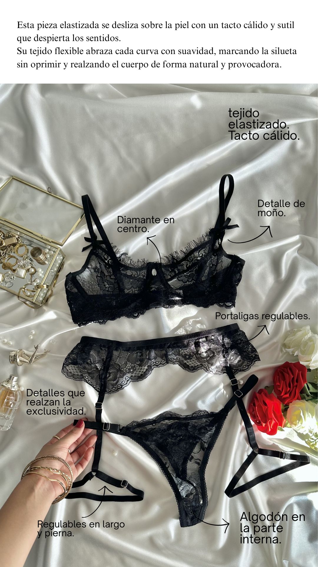 - Un portaligas seductor para añadir un toque de encanto innegable.
