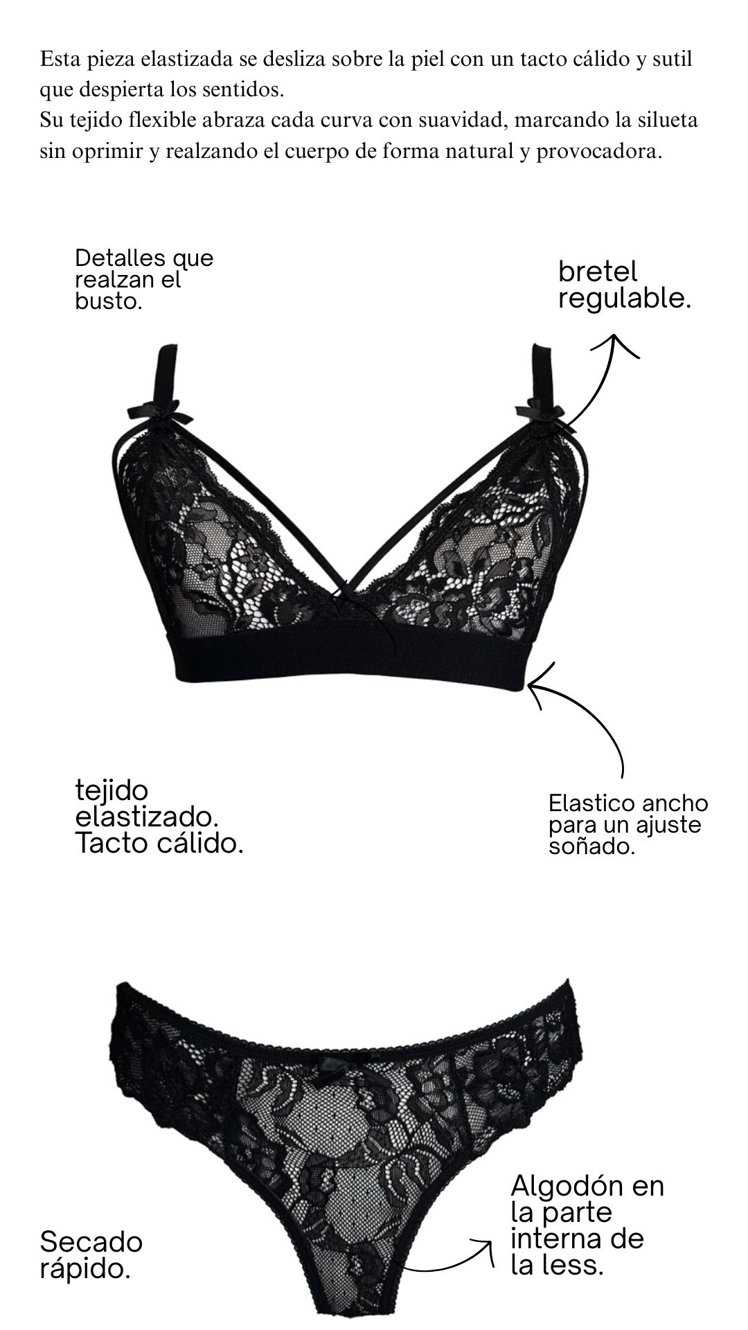 Conjunto de encaje con estructura, ideal para quienes prefieren una sensación liviana y cómoda. El corpiño tiene un elástico ancho bajo busto que aporta una sujeción suave y firme generando estructura. Combina encaje elástico con una base más deportiva, perfecta para un look relajado pero sensual.