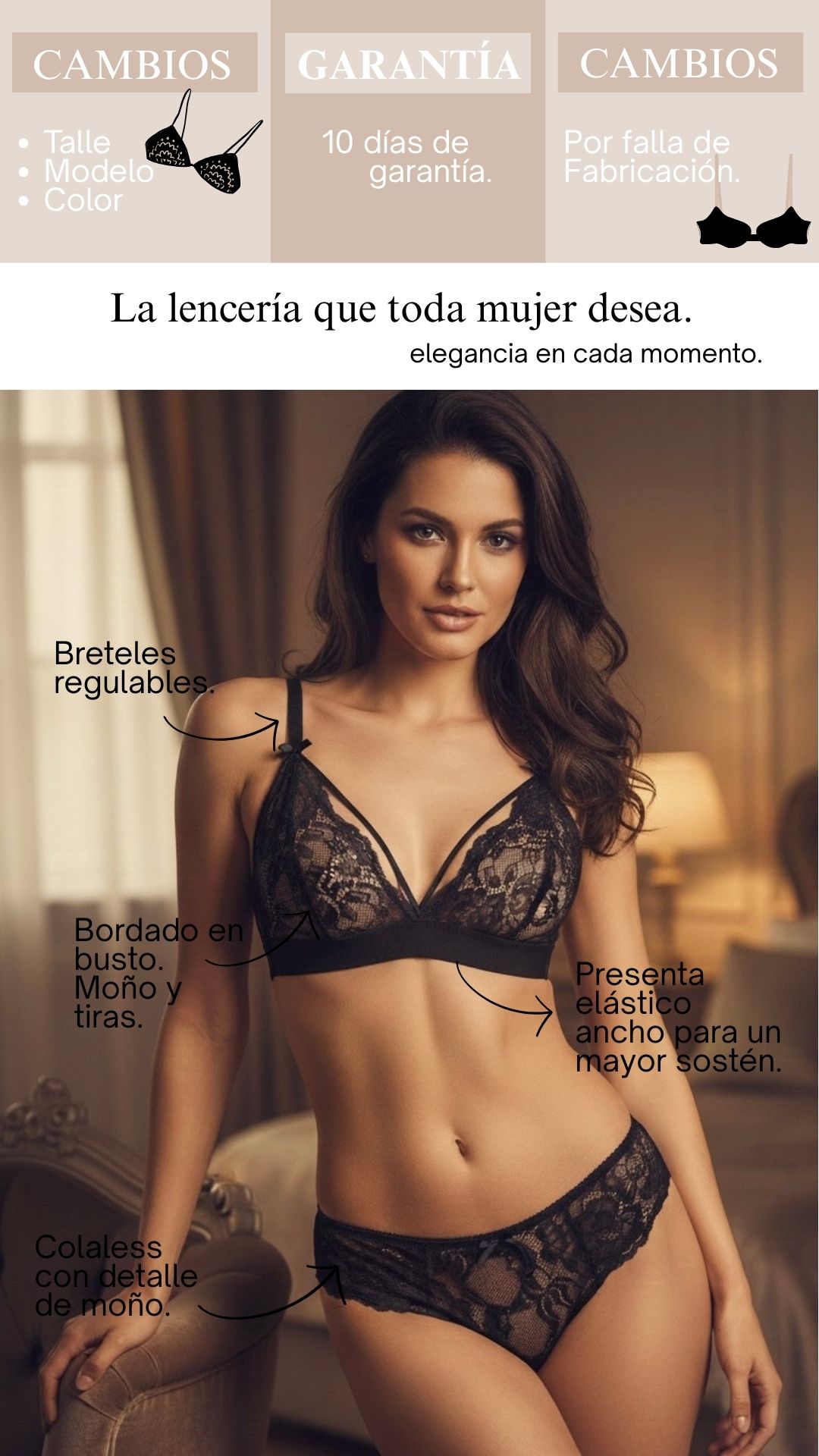 Gracias al elástico ancho bajo busto, el corpiño se adapta con firmeza sin apretar. Al no tener aro ni relleno, ofrece libertad total de movimiento. Breteles regulables para que se acomode perfecto a tu cuerpo. La colaless es liviana, suave y se ajusta sin marcar viene por talle lo cual genera mas comodidad y elegancia sin ajustar.