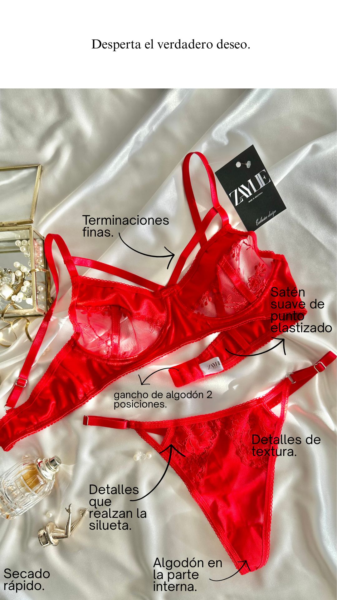 El diseño fue pensado para adaptarse al cuerpo como una segunda piel. Tiras ajustables, broche trasero con regulación y telas suaves al tacto permiten un calce preciso, sensual y cómodo al mismo tiempo.